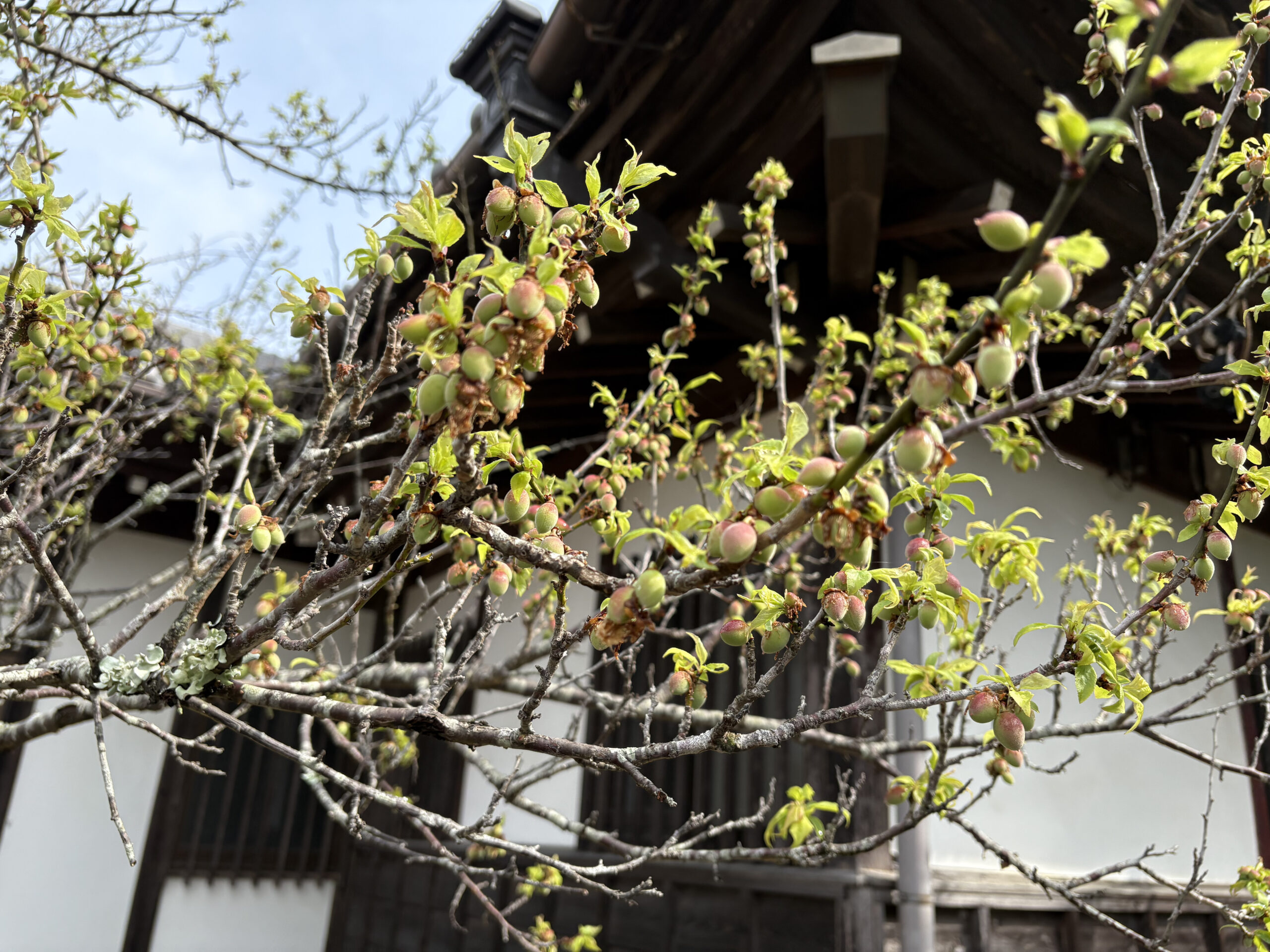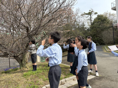 5年生が朝の校長先生の時間に梅の観察を行いました。4年生の3月からつぼみ、花を観察し、今回は小さな実を観察しに行きました。