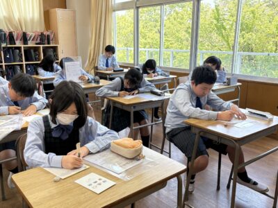 6年生が約1年後(卒業式)の時の自分にむけて手紙を書きました。1年後、自分自身がどのような人になっていたいと考えているのかをイメージしながら丁寧に文章にしました。書き終えた手紙は封をして保管し、卒業式の日に開封します。