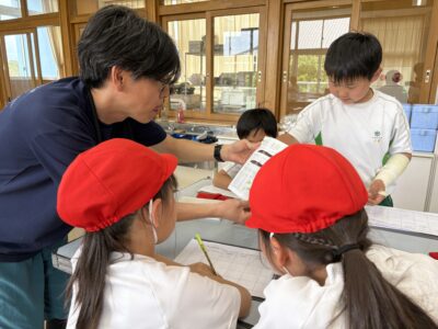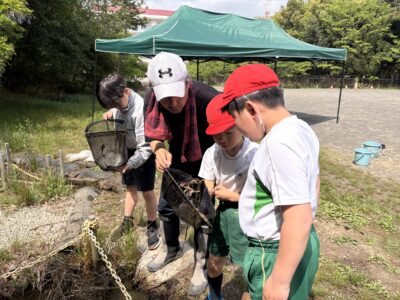 4年1組が小学校のビオトープの生き物調査を行いました。児童はたも網とバケツをもって生き物の採集をしました。メダカはもちろん、シオカラトンボのヤゴやギンヤンマのヤゴ、ホトケドジョウ、アカハライモリなど多くの生き物を採取することができました。初め生き物を触ることができなかった子供たちも採集と観察をしていくうちに触れるようになりました。