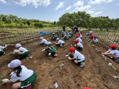 5月7日(水)に1年生がサツマイモの苗植えを行いました。今年度も柳川農園さんにお世話になり、サツマイモの植え方について説明していただきました。子供たちは慣れない手つきでありながらも、一つ一つ「大きくなれ」と願いを込めて植えていました。秋になったら収穫も予定しています。今からとても楽しみです。