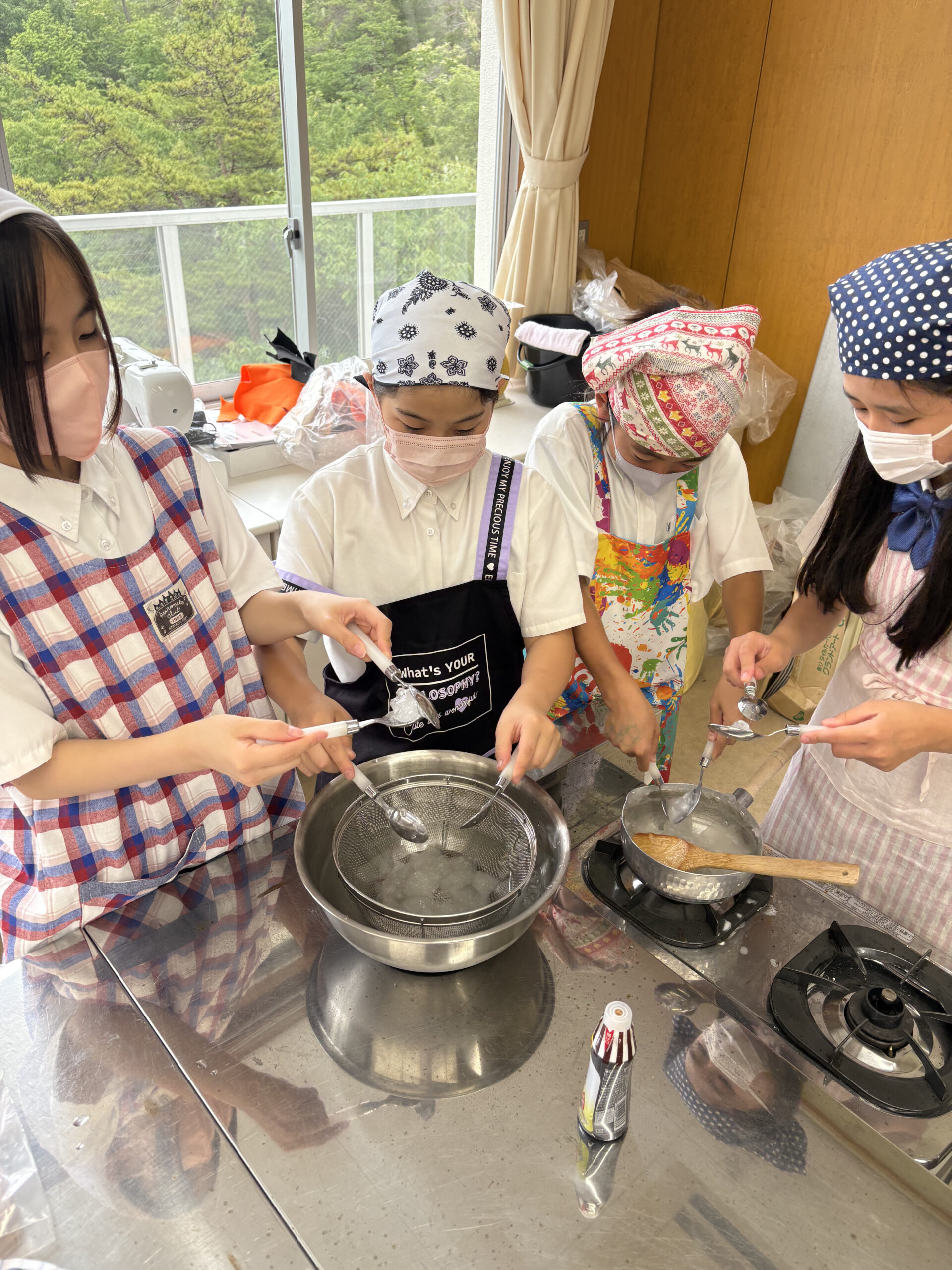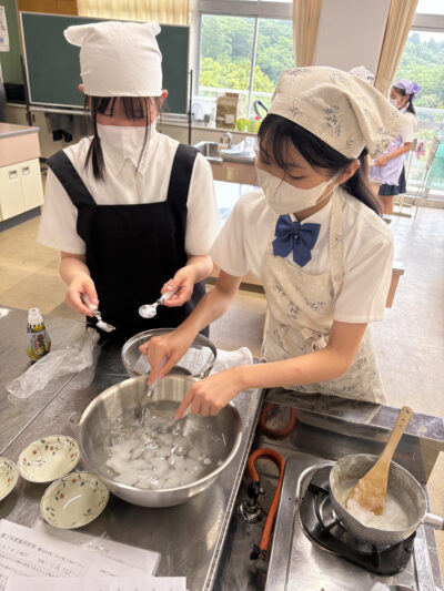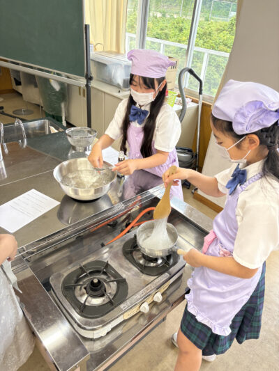 6月9日(月)同好会活動を実施しました。家庭同好会の活動では、高学年の子どもたちが片栗粉を使ってわらび餅作りに挑戦しました。最初は「片栗粉でわらび餅ができるの?」と不思議そうな声も上がりましたが、材料を混ぜて火にかけると、みるみるうちに透明でとろりとした生地に変わっていく様子に、子どもたちからは「すごい!」「お餅みたい!」と歓声が上がりました。熱い鍋の前で交代しながら一生懸命混ぜたり、冷たい水で冷やして形を整えたりと、グループで協力しながら作業を進めました。初めてのわらび餅作りに、戸惑いながらも真剣に取り組む姿はとても頼もしかったです。