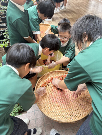 5年生の「津田の梅干し」作りの最後の工程となる土用干し作業を行いました。本来は梅雨が明けた土用の期間に行う工程ですが、あまりにも順調な漬かり具合と梅雨明けのような天候を見て、かなり早いのですがこの日に実施しました。竹ザルに並べていくだけの単純な作業ですので、みんなで協力して手際よく進めることができました。が、なにしろ収穫量が多かったため、すべての梅を並べることができず、来週あたりに第2弾を計画しなければならない羽目になりました。干し上がりが楽しみで仕方のない様子の5年生でした。