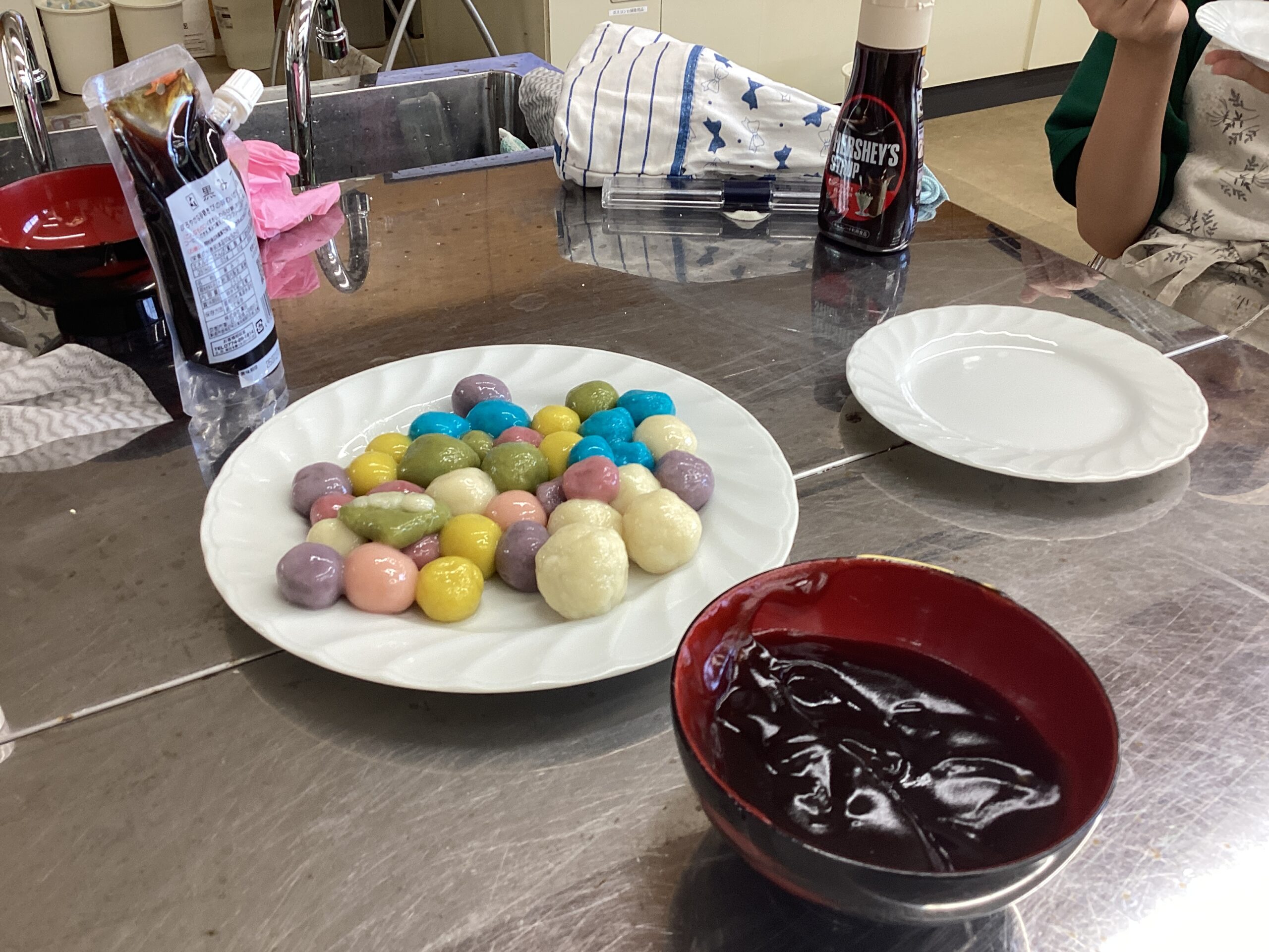 家庭同好会:家庭同好会では、みんな大好きみたらし団子作りに挑戦!生地をこねて、丸めて、ゆでて、タレをからめて…と、協力しながら作業を進めました。カラフルな団子も完成し、見た目も楽しい、美味しいみたらし団子に大満足でした。