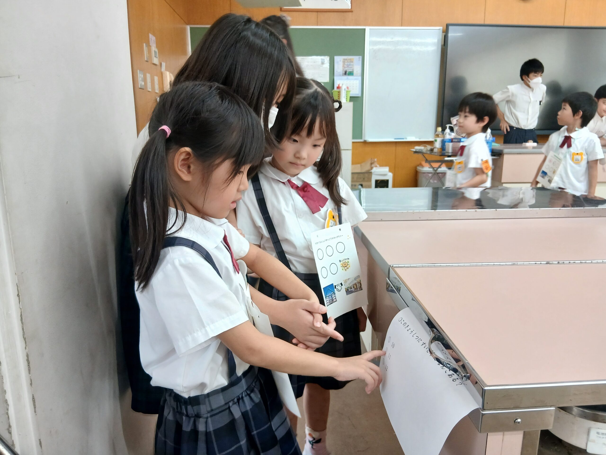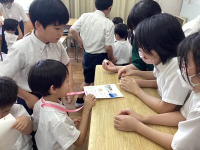 先日、6年生が津田三滝幼稚園の園児たちと交流会を行いました。今回の交流会は、企画から準備、当日の運営まで、全て6年生が主体となって進めました。グループごとに企画案を発表し、みんなで投票して内容を決定。選ばれたのは、園児たちが楽しめる「クイズスタンプラリー」でした。5つの教室を巡り、クイズに答えてスタンプを集めるこの企画。6年生は、各教室でスタンプを押す係や、園児と一緒に教室を回る係など、役割分担をしながらスムーズな運営を心がけました。クイズに正解してスタンプをもらった園児たちは、とても嬉しそうな笑顔を見せてくれました。そんな園児の姿に、6年生も達成感を感じていたようです。