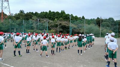 先日、運動会の予行演習を実施しました。最初の予行演習では、本番の流れを掴むため、入場行進から開会式と閉会式までの流れを中心に確認しました。入場行進では、腕をしっかり振ること、足を高く上げることなどを意識しましたが、本番に向けてもう少し練習が必要です。