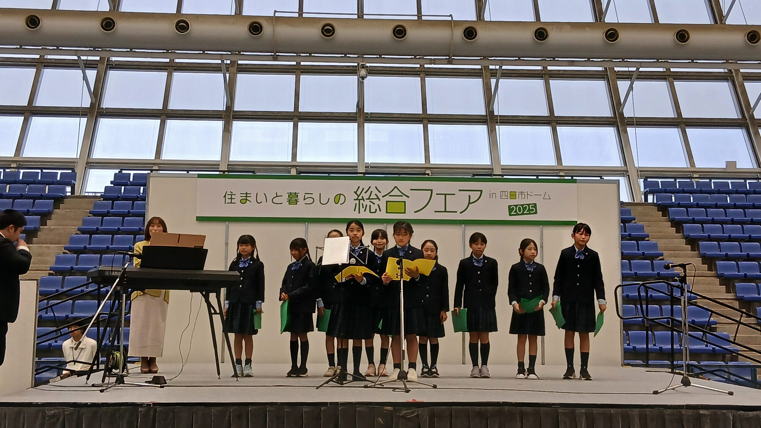 10月25日(土)、合唱部が四日市ドームで演奏を披露しました。この日は、「住まいと暮らしの総合フェア」という住宅メーカーや地元工務店、金融機関、通信、美容・健康などの専門企業がブースを構え、私たちの生活に身近な情報が盛りだくさんの三重県下最大級の総合生活イベントが開催されています。合唱部はその中のステージ部門に参加をさせていただきました。会場内はとてもにぎわっており、合唱部員たちは会場の広さに圧倒されながらも、気持ちを落ち着かせて本番に臨んでいました。あまりに広すぎて声が遠くまで届かなかったようでしたが、口を大きく開けて精一杯歌っていたと思います。合唱部員たちにとって貴重な経験になっただけでなく、津田学園小学校合唱部の認知度が上がったと思います。今後の活動につなげていきたいです。