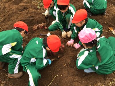 5月に柳川農園で自分たちで苗を植えたサツマイモが立派に育ち、11月5日(水)に芋掘りを行いました。子供たちは夢中になって土を掘り続け、大きなサツマイモが掘り出されるたびに、喜びにあふれた笑顔を見せてくれました。中には子供の顔よりも大きいサツマイモを掘り当てる子も!1人では掘り出せない大きなサツマイモは、友達同士で協力して掘る姿が印象的でした。