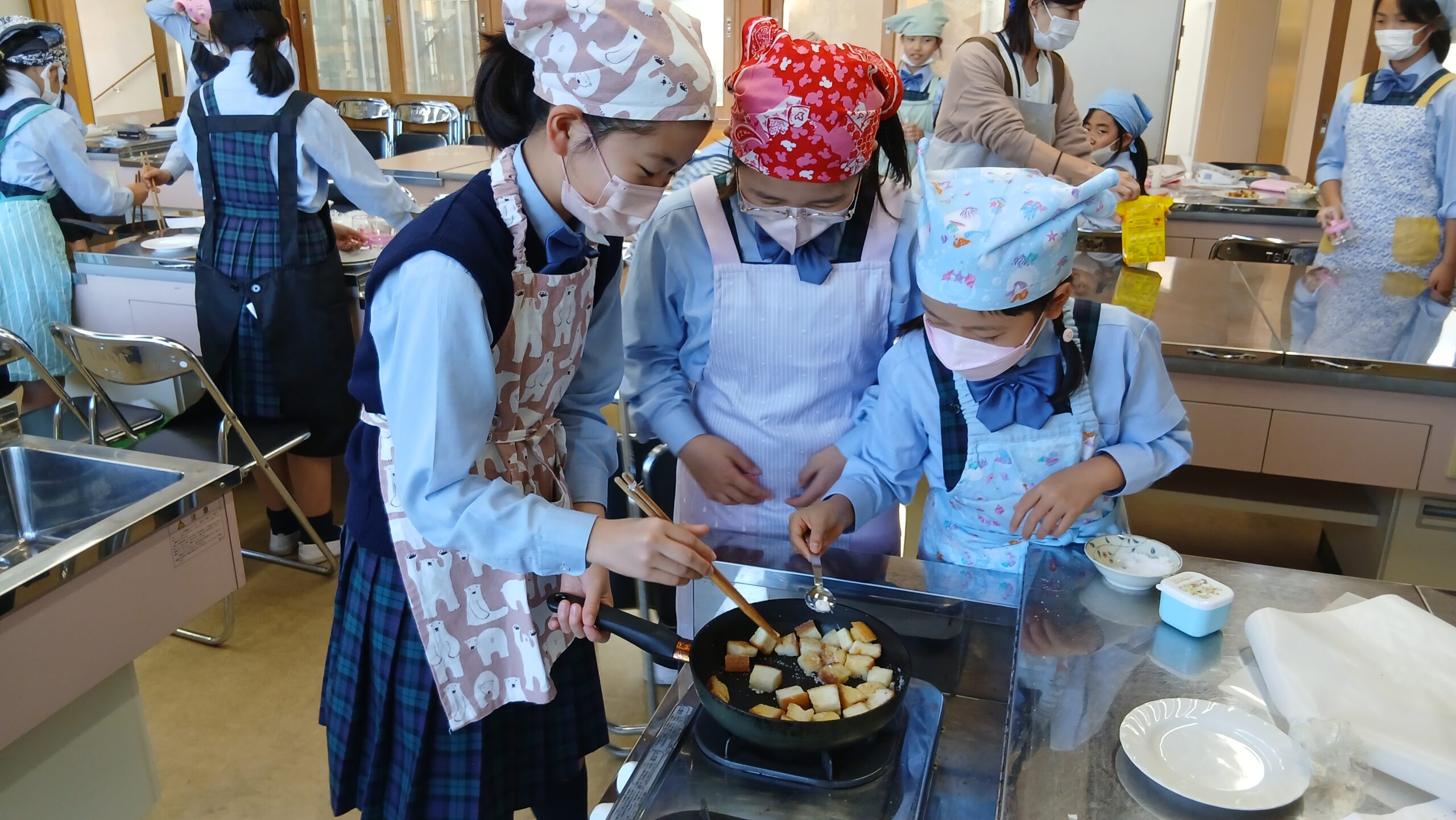 家庭同好会では、お菓子作りに挑戦!今回は、香ばしくて甘いラスクを作りました。パンを薄くスライスし、バターと砂糖を塗って焼き上げる工程を協力して行い、サクサクの美味しいラスクを完成させました。