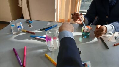 サイエンス同好会では、ペーパークロマトグラフィーの実験を行いました。様々な水性ペンの色が、実はいくつかの色の成分からできていることを、コーヒーフィルターを使って分離させながら調べました。子供たちは、予想外の結果に驚きながら、科学の楽しさを体験することができました。