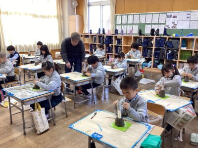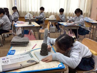 本日、2年生が陶芸教室を行いました。1年生の陶芸教室と同様に、陶芸家の熊本栄司さんに教わり鉛筆立てを作りました。先生の説明をよく聞き、楽しく作業に取り組むことができました。また、友達と自分の作品を紹介し、アドバイスをし合う姿も多く見られました。ヘラを使って名前を書いたり、埴輪のような形にアレンジをするなど自由に形を作ることに面白さを感じ、一生懸命に「自分らしさ」を表現しました。割れないように、焼成前に粘土が取れないかチェックをしてくださるそうです。無事に焼き上がり、どんな仕上がりになるのか楽しみですね。