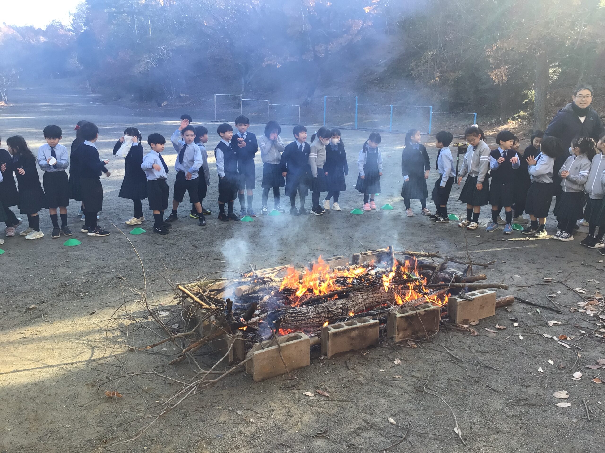 本日、1年生が校庭で焼きいもパーティーを行いました。今回使用したサツマイモは、子供たちが5月に苗植えをし、秋に愛情込めて育てて収穫した、思い出の詰まったサツマイモです。児童は一人につき2個のサツマイモを水で洗い、丁寧にアルミホイルに包みました。焚き火に使用する木の枝は、子供たちがこの日のために休み時間を使って山で集めてきたものです。準備が整ったサツマイモを校長先生が焚き火でじっくりと焼き上げてくれました。焼き上がったサツマイモは、ホクホクしていて甘く、みんな笑顔いっぱいで口に頬張っていました。
