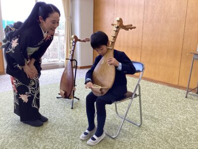 3、4年生で琵琶出前授業が実施されました。講師として、琵琶奏者の野島洋美さんに来ていただき、琵琶の歴史や楽器についての説明、琵琶の実演や体験を行いました。特に、実演「耳なし芳一」では、芳一が耳を切られるシーンの緊張感から子供たちも真剣に聴いていました。体験では、本物に触れる貴重な経験ができましたね。野島洋美様、素晴らしい授業をありがとうございました。