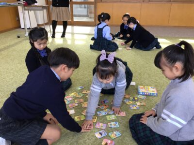 1月14日(火)、1年生がかるた大会を行いました。前日からこの日をとても楽しみにしていた子供たち。いざ大会が始まると、それまでの賑やかさが嘘のように一気に場が静まり返り、心地よい緊張感の漂う厳かな雰囲気の中で幕を開けました。今回は、クラス混合のグループで対戦を行いました。普段の教室とは違うメンバーとの対戦に、子供たちは新鮮さを感じながらも、クラスの枠を超えて仲良く、そして全力で札を競い合っていました。読み手の声に全神経を集中させ、目当ての札を見つけた瞬間、あちらこちらから「はいっ!」という元気な声が響き渡りました。