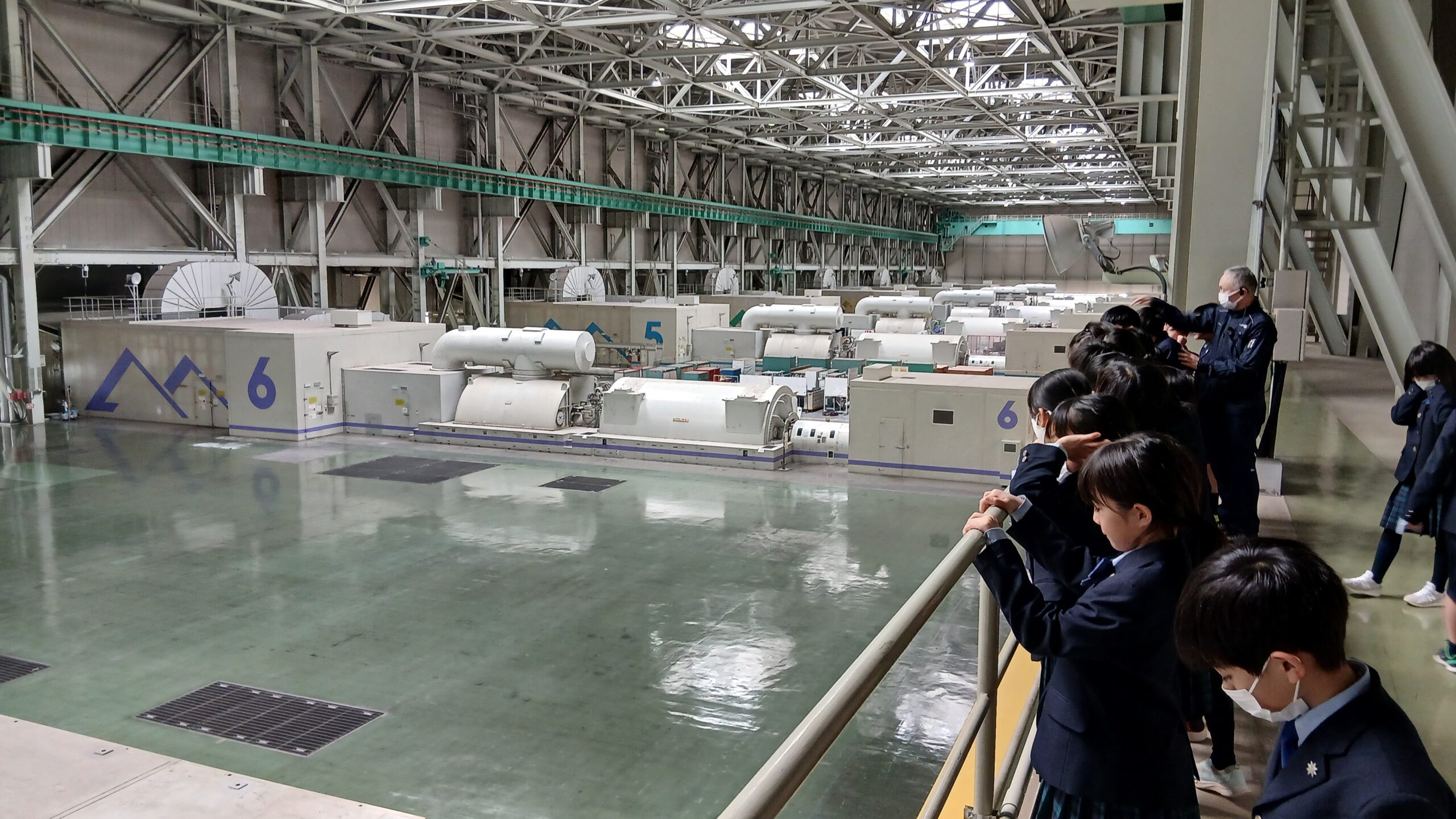 先日、3年生が私たちの暮らしを支えるエネルギーの拠点、川越火力発電所の見学に行きました。ここは世界最大級の規模を誇る発電所で、子供たちはその広大さに驚きながら見学をスタートしました。まずは「電気実験教室」に参加しました。クイズに挑戦して知識を深めた後は、手回し発電を体験。一人一人が一生懸命にハンドルを回して電気を作ろうとしましたが、小さな電球を灯すだけでも一苦労です。自分の手で電気を作る大変さを実感したことで、効率よく大量の電気を作り出す火力発電の技術のすごさを、身をもって学ぶことができました。後半は、いよいよ発電所内部の見学へ。 目の前に広がる巨大な機械と、お腹に響くような力強い音に、子供たちは興味津々!教科書や動画だけでは決して味わえない、本物の迫力に圧倒された様子でした。私たちの生活を支える電気がどのようにして届けられているのか、現場の熱気を感じながら深く理解することができた貴重な一日となりました。