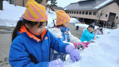 白川郷の合掌集落から少し離れた白山ホワイトロードの入り口にあるトヨタ白川郷自然学校が宿泊施設です。到着してすぐに雪の灯ろう作りに取り掛かりました。夜になってその灯ろうにろうそくで明かりを灯しました。なんとも幻想的な空間が広がり、みんな時間と寒さを忘れて見入っていました。夕食はフレンチのコースでこの日のメインはハンバーグでした。デザートにアイスとチーズケーキがついてきて4年生も大満足でした。