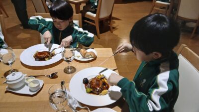 雪の学校1日目・夜:幻想的な灯ろうと、心躍るフレンチコース