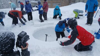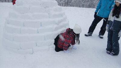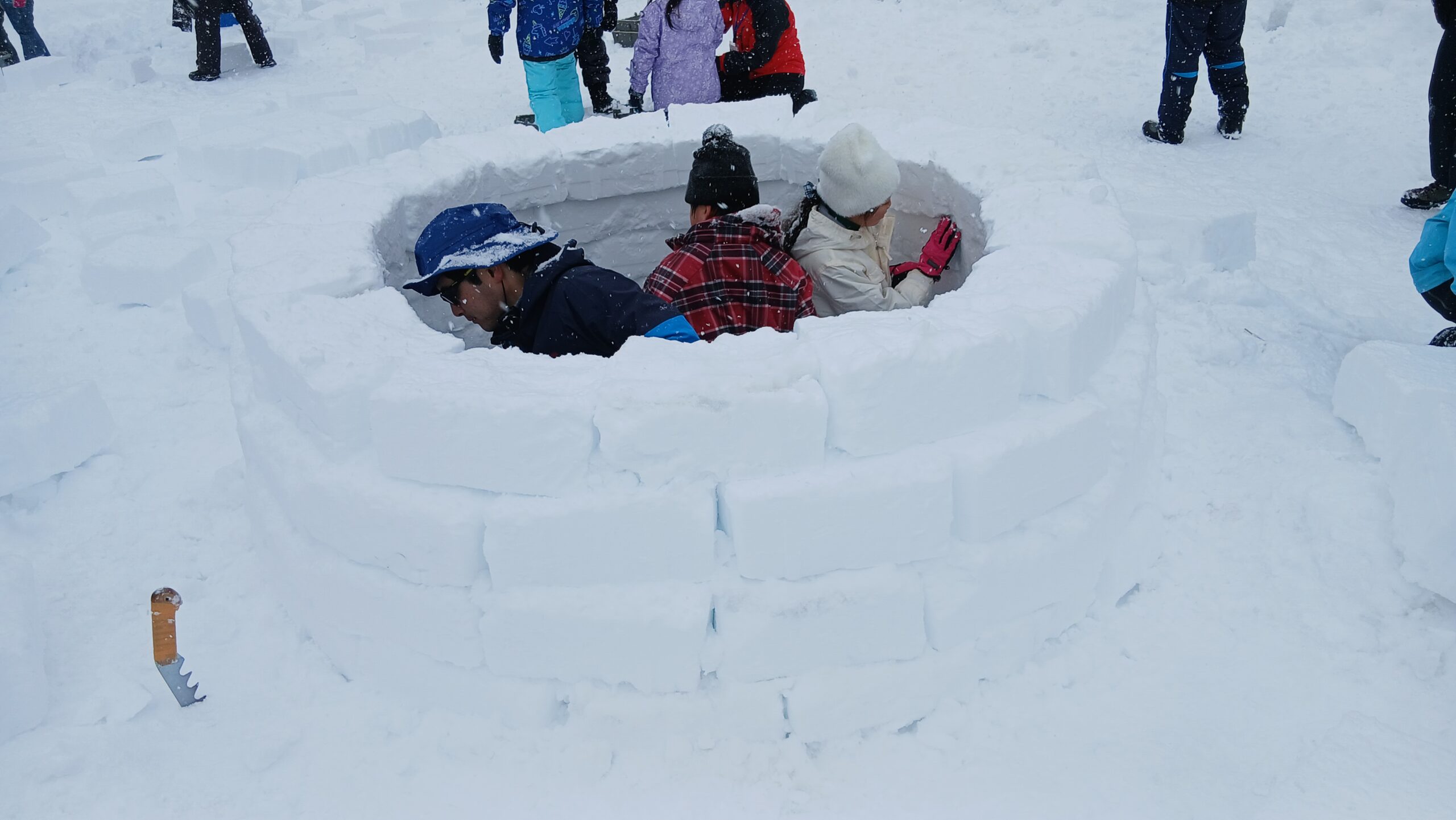 雪の学校、2日目の午後はイグルー作りです。イグルーは雪のブロックを積み上げて作るドーム型のかまくらです。たくさんのブロックを使うため、まずはひたすらブロックを作りました。マイナス5.5度の中、降ったばかりの粉雪はなかなか固まってくれません。三重県に降る雪との違いを体感しながら、足でしっかりと踏み固めてブロックにしていました。そのブロックを円形に積み上げ、徐々に小さくしてドームの形にしていきました。最後に頂点のブロックを乗せて完成です。出入り口の穴を開けると中に入ることができ、みんなで完成を喜び合いました。