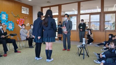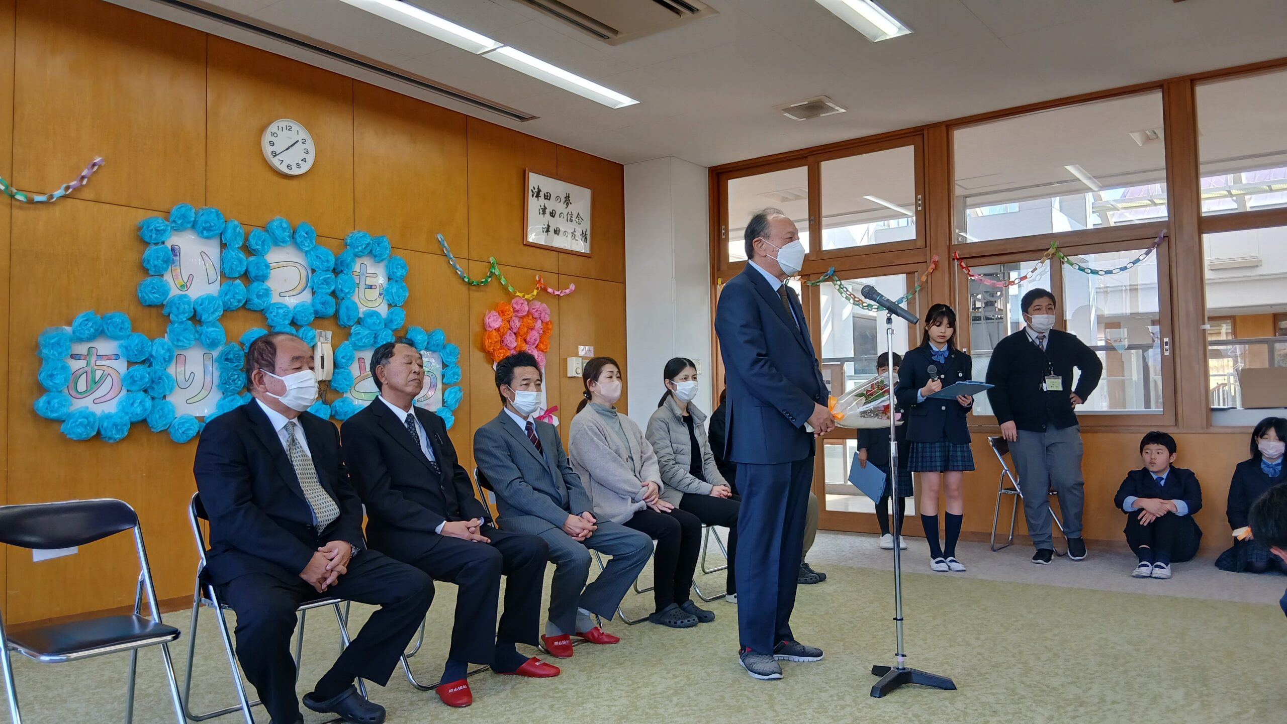 集会は、各学年の代表児童による花束の贈呈から始まりました。 「いつもありがとうございます」と、一人一人が心を込めてお渡しすると、ゲストの皆様からは温かな励ましのお言葉をいただきました。私たちが当たり前のように過ごしている毎日は、こうした多くの方々の支えがあってこそだと、改めて実感する瞬間でした。続いて、6年生が作成した特製のメッセージカードをプレゼントしました。 カードには、感謝の気持ちを綴った「あいうえお作文」が記されています。感謝のメロディーとして、合唱部が「Believe」を披露しました。 会場に響き渡る澄んだ歌声が会場全体を温かな空気で包み込みました。聴いている児童たちも、その美しいハーモニーに聴き入っていました。集会の最後には、全校児童で声を合わせ、精一杯の「ありがとうございました!」を届けました。普段はゆっくりお話しする機会が少ない方々へ、自分たちの言葉と行動で「ありがとう」を形にできた、とても素敵な時間となりました。これからも感謝の気持ちを忘れずに、バスの利用や給食の時間を大切にしていきましょう。