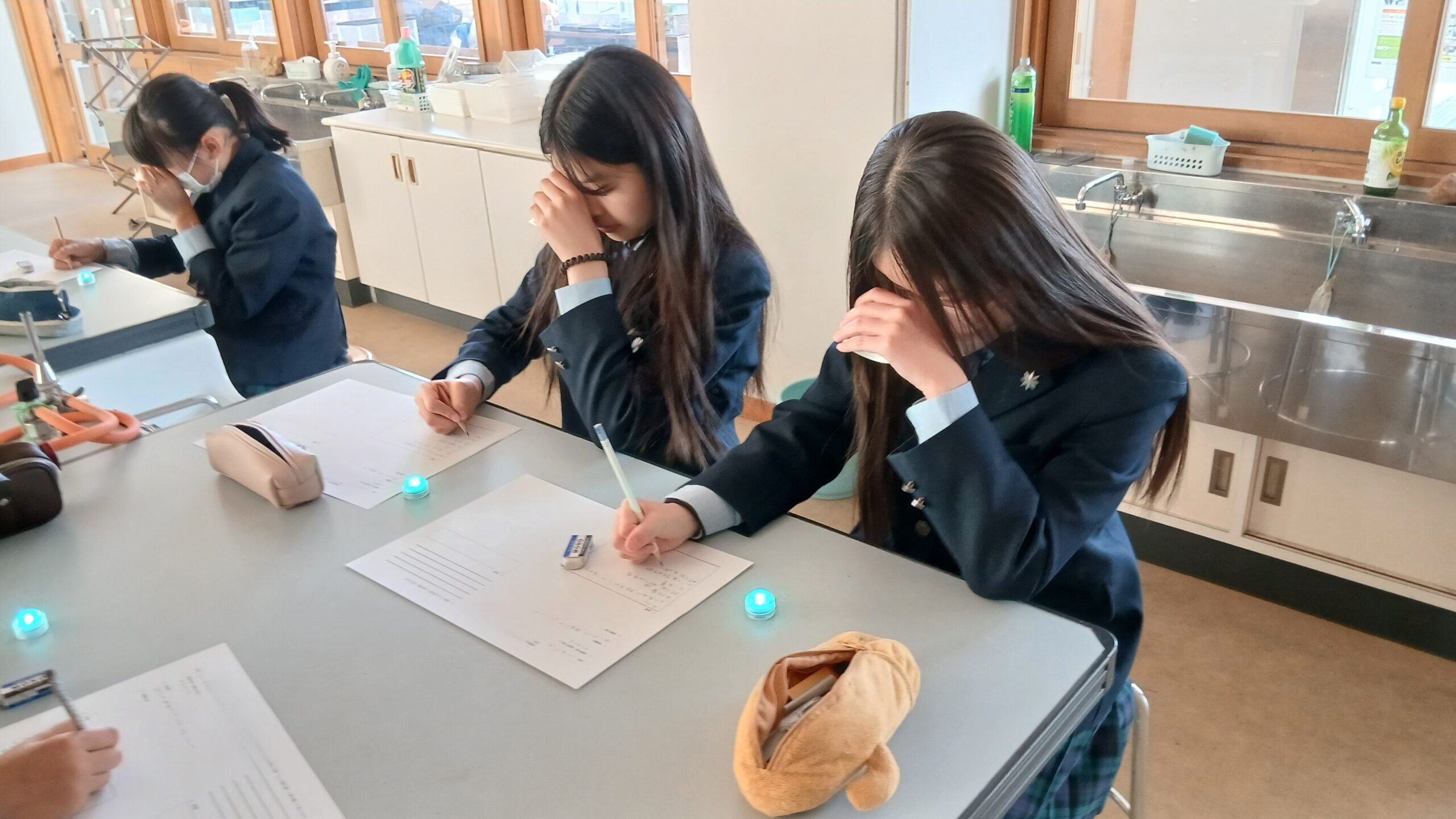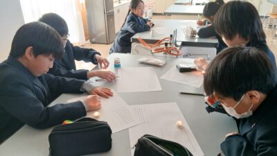 完成したスコープで、まずは理科室の天井にある明かりを覗いてみました。すると、ただの白い光に見えていたものが、パッと美しい虹色に分かれて見えました。この観察から、私たちが普段見ている光は、実は「さまざまな色が混ざり合ってできている」ということがはっきりと分かりました。次に、さまざまな色のライトを使って、さらに詳しく観察を進めました。白い光が「赤・青・緑」の3つに分かれたことで、この3色が光の基本となる「光の三原色」であることを身をもって実感できました。逆に、赤や青そのものの光は、それ以上分けることができない「純粋な色」であることも分かりました。さらに、中間色についても詳しく調べました。オレンジ色:赤と緑が混ざっている!水色:青と緑が混ざっている!紫色:赤と青が混ざっている!「絵の具を混ぜるのと同じかな?」と思いきや、光の場合は混ぜれば混ぜるほど明るく、白に近づいていくという不思議な性質(加法混色)があります。一人一人がレンズ越しに色の正体を発見するたびに、驚きの声が上がっていました。普段何気なく浴びている光も、分光スコープを通せば全く違う表情を見せてくれます。自分たちの手で作った道具で科学の法則を解き明かす、ワクワクの詰まった活動となりました。