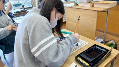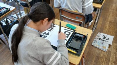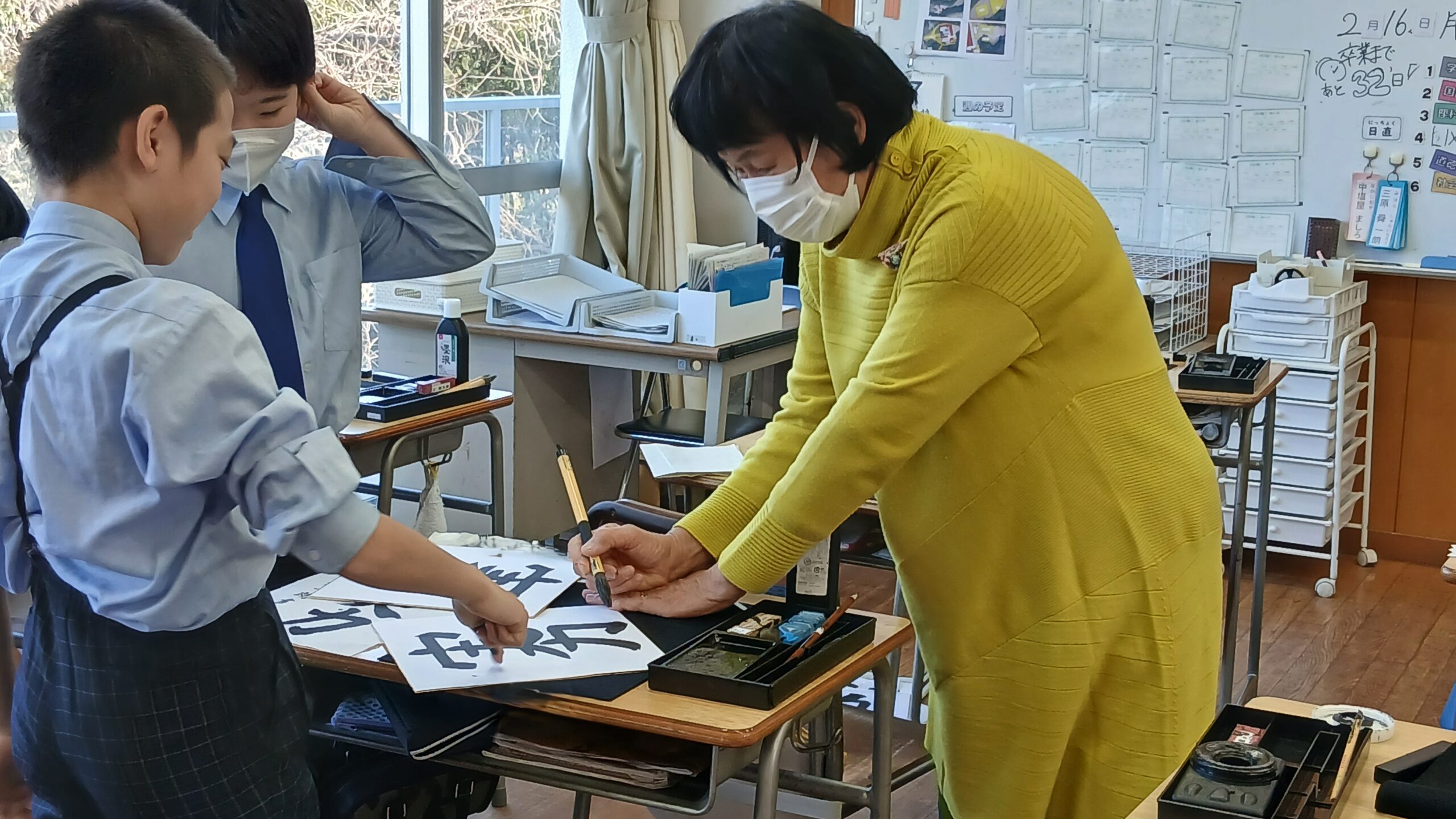 卒業式を目前に控え、6年生が小学校生活最後となる「書道指導」に臨みました。卒業制作として子供たちは、これまでの自分を振り返り、そしてこれからの未来を見据えて、各々が大切にしたい一文字や熟語を選びました。いざ清書が始まると、教室は心地よい緊張感に包まれました。真っ白な色紙を前に、一筆一筆に全神経を集中させる姿は、最高学年としての風格を感じさせるものでした。「跳ね」や「払い」の細部までこだわり、納得のいくまで自分と向き合う姿は、まさに6年間の集大成。書き終えた後の子供たちの表情は、どこか晴れやかで、やり遂げた自信に満ちていました。この色紙に込めた想いを胸に、残り少ない小学校生活を大切に過ごしてほしいと願っています。