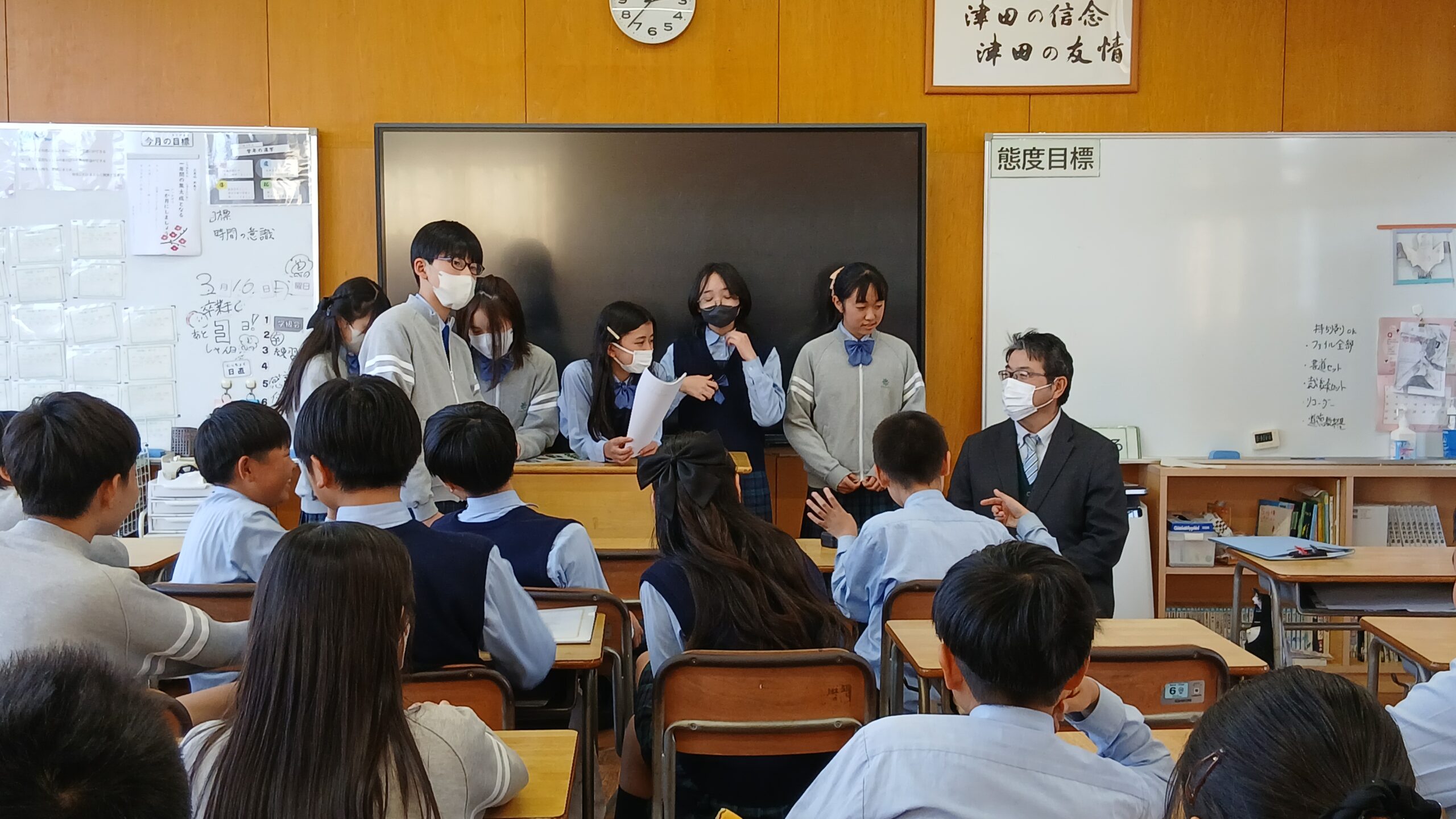 1組では、一人一人が自分の言葉で先生方にメッセージを伝えました。「あの時のアドバイスが励みになりました」「先生と笑い合った休み時間が一番の思い出です」など、当時のエピソードを交えながら語られる感謝の言葉。先生方は一人一人の成長を感じ取られるように、頷きながら真っ直ぐに子供たちの目を見て耳を傾けていました。素直な想いが溢れる、1組らしい誠実な時間となりました。