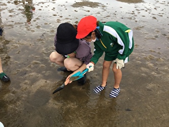 「海の学校」とは、さまざまな海の小動物に直接触れることにより、海やそこに住む生き物に興味・関心をもたせ、自然科学の基礎学力を培うことを目的として毎年1年生が行っている行事です。今年度も三重郡川越町高松海岸に行きました。