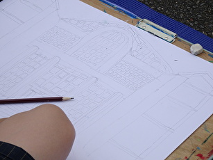 最初の校長先生のお話でこの校舎は創立17年になるとお話がありました。17年目ともなるとだんだん汚れも出てくるがそれも味になるというものです。児童は、その汚れなど校舎の細部まで監察し、描いていました。児童たちからは「毎日見ているから簡単だと思っていたけど、意外と難しかった」といった感想があがりました。それだけ、よく観察して描くことは難しいということですね。