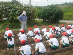 9月30日(木)に、2年生が大根の種まきを行いました。農園主の柳川様から、作物が育つための3つの条件や種の植え方についての説明を受けました。その後、畑に子どもたちの手で慎重に種を植えていきました。