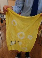 この季節になると空き地にたくさん姿を見せるセイタカアワダチソウの花は、黄色い染料として使えます。たくさんの花を寸胴鍋で煮て、各自持参した綿の薄布を濃染処理した後、絞り染めを体験しました。輪ゴムのしばり方(絞り)によっていろいろな模様が生まれます。15分ほどの時間でも染液に着けて黄色く染まった布は美しく、水でしっかりと洗ってから持ち帰りました。
