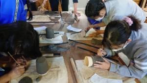 11月9日(火)に6年生が四日市市にある萬古焼窯元の「醉月陶苑」さんで陶芸教室を体験しました。四日市萬古焼は約300年の歴史があり土鍋や急須の生産で有名です。ご指導いただく清水さんに、登り窯や焼成温度、陶器を焼く時に使用する薪の種類、今日の器の作り方についてのお話をしていただき、児童それぞれが教えていただいた「タタラ作り」の作り方に沿って湯呑を作りました。伸ばした粘土板を器の型にあてて成形し、表面に自分のデザインを施していきます。最後に器の底に名前を書いて、飲み口を滑らかにすると完成です。粘土の柔らかな感触や、使い慣れない道具に一喜一憂しながら皆楽しく作陶しました。最後にはろくろを使って急須を作る工程も見せていただき、見事な手わざに子どもたちの歓声が上がりました。作品は乾燥と焼成までをしていただき、12月頃に完成品を届けていただける予定です。