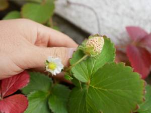2年生のベランダにて栽培しているイチゴの苗に実が付きました。 この苗は来年の一年生たちに引き継げるよう、水やりを継続していたものです。 今年の11月は暖かい日が続いたためか、たくさんの花が咲いていました。 児童は「もしかしたら実ができるかも!」と期待しながら見ていたようでしたが、本当に赤く色づいた実ができました。 ビニールで覆ったり工夫したりしていたわけではないので担任も驚いています。