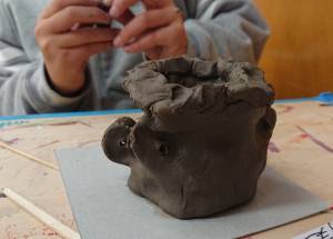 12月1日に1年生が、2日には2年生が陶芸家の熊本先生をお迎えして、それぞれの教室で陶芸の指導をしていただきました。はじめに熊本先生から陶芸や万古焼についてお話をしていただき、1,2年生にもできる鉛筆立ての作り方を教えていただきました。粘土の塊に指で穴を開けて新聞紙を包み、縦長の入れ物を作ります。柔らかい粘土の感触に教室のあちこちから歓声が上がりました。上手くできないところは先生に手伝ってもらいながら、皆それぞれ個性的な入れ物ができていきます。表面の装飾には思い入れやこだわりが感じられました。最後に各学年の代表の児童が熊本先生にお礼を伝えました。作品は熊本先生の工房で乾燥と釉薬掛け、焼成をしていただき、1月に完成品を津田学園小学校に届けていただける予定です。