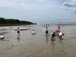 今回は、前日の大雨のおかげか非常にたくさんの生き物を見つけることができました。「イソシジミ」「スナガニ」をはじめ、「アナジャコ」や「ハゼのなかま」などたくさんの生き物に触れる機会に恵まれました。海の危険な生物についても、大雨の影響か浜辺に「ミズクラゲ」「アカクラゲ」などが打ちあがっており、児童もクラゲを生で見ることができ興奮しながらも怖い生き物もいるのだと学んでいる様子でした。