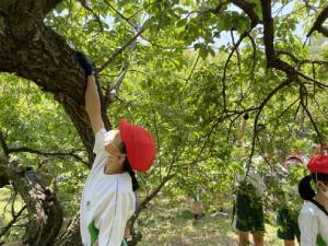 6月2日(木)に5年生は、農育の一環で行っている梅干しづくりのため、梅の実を収穫しました。収穫は桑名市多度町にある梅園に行きました。児童は梅園に着くと、たくさんの梅の実が生っていることに驚いていました。さらに、梅の実は大粒で、予想を上回る大きさだったようで、「すごく大きい」「こんなに大きいもの初めて見た」などの声が聞こえ、とても興奮している様子でした。
