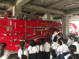 到着後はまず消防の仕事について詳しく説明をしていただきました。その後、実際に消防署内を案内していただき、見学しました。消防士さんたちの生活スペースや、防火衣など実際に身に着けている装備、消防車や救急車の中まで見学させていただき、新しいことをたくさん知ることができました。見学の後は疑問に思ったことも質問する時間があり「なぜ番号は119番なのですか。」や「救急車に書いてあるEMSとはどういう意味ですか。」という質問にも答えていただきました。消防署を見学し、本物を近くで見たり、消防士さんの話を聞いたりしたことで、社会科の授業で得た知識がより広がりました。