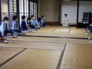 児童は慎重にお盆を運び、畳にの縁を目印にお茶とお菓子を置いていました。