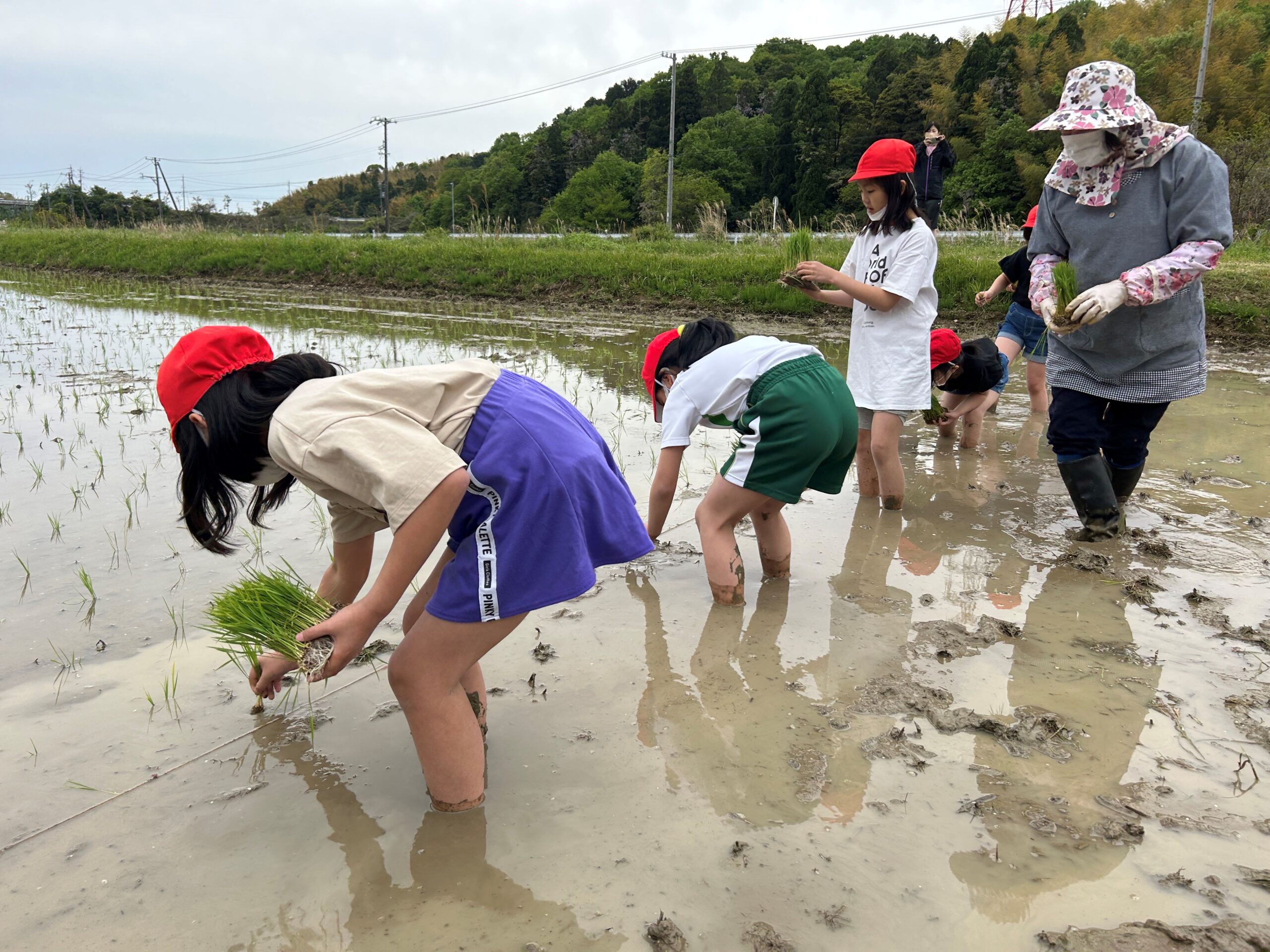 4月24日(月)に 3・4年生は嘉例川営農組合様にご協力いただいて田植えをしました。3年生は初めての田植えで慣れないながらも頑張って稲の苗を植えることができました。4年生は昨年度に続いて2度目の田植えでした。子どもたちは、田植え綱を使って昔ながらの田植えをすることで、米を作ることの大変さを実感することができました。また、秋の稲刈りが待ち遠しいようでした。