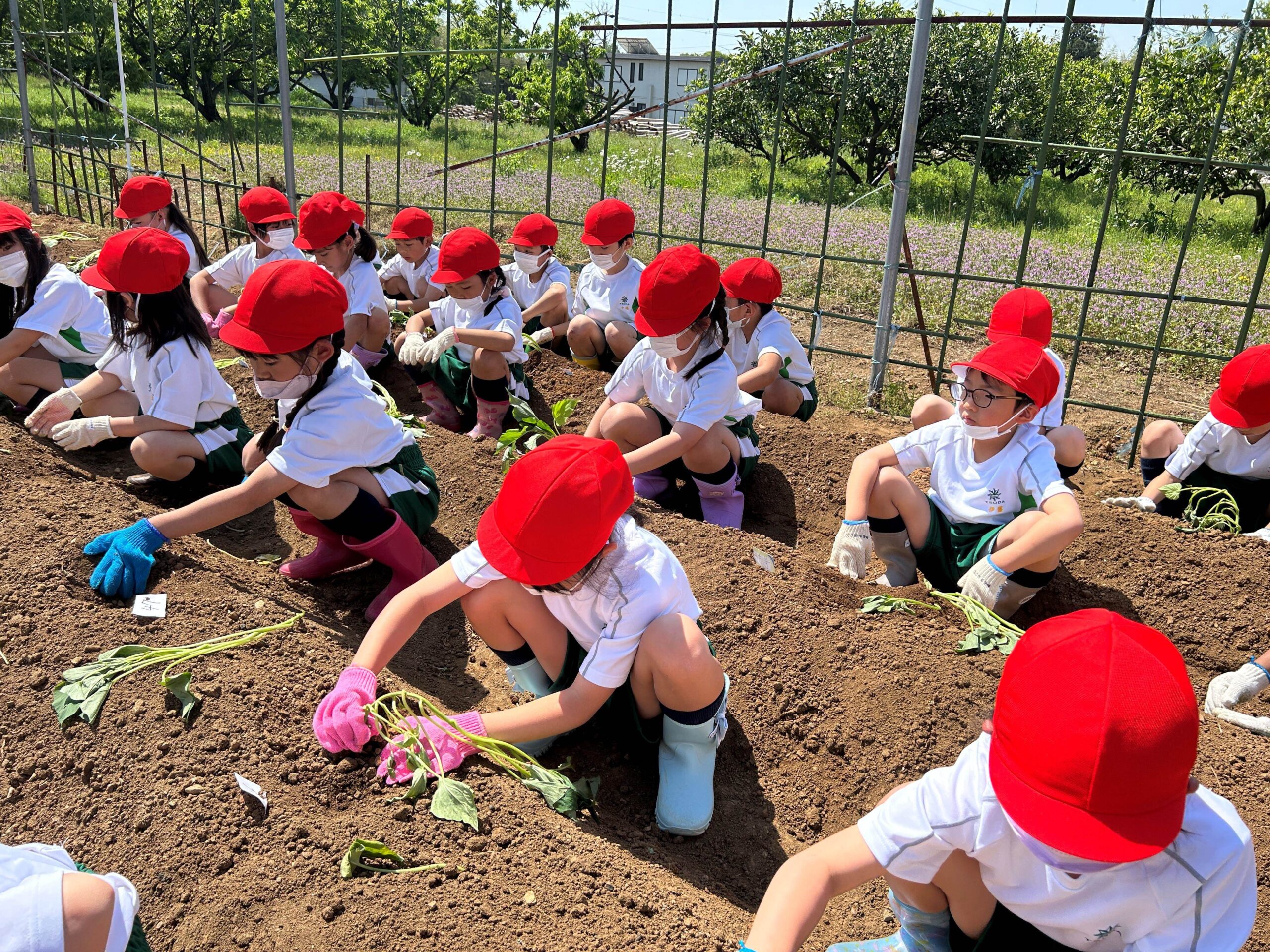 5月10日(水)、1年生がサツマイモの苗植えのために柳川農園さんに行きました。苗の植え方の話を真剣に聞き、子供たちは1人2本ずつ苗を植えました。苗を植えるときは手で土を掘り、1本ずつ丁寧に心を込めて植えました。サツマイモの苗を植えた後は柳川農園さんの中を案内していただきました。子供たちはみかんの花に興味を寄せていました。 10月頃には大きなサツマイモがたくさんできると思います。子供たちは今から収穫を楽しみにしています。