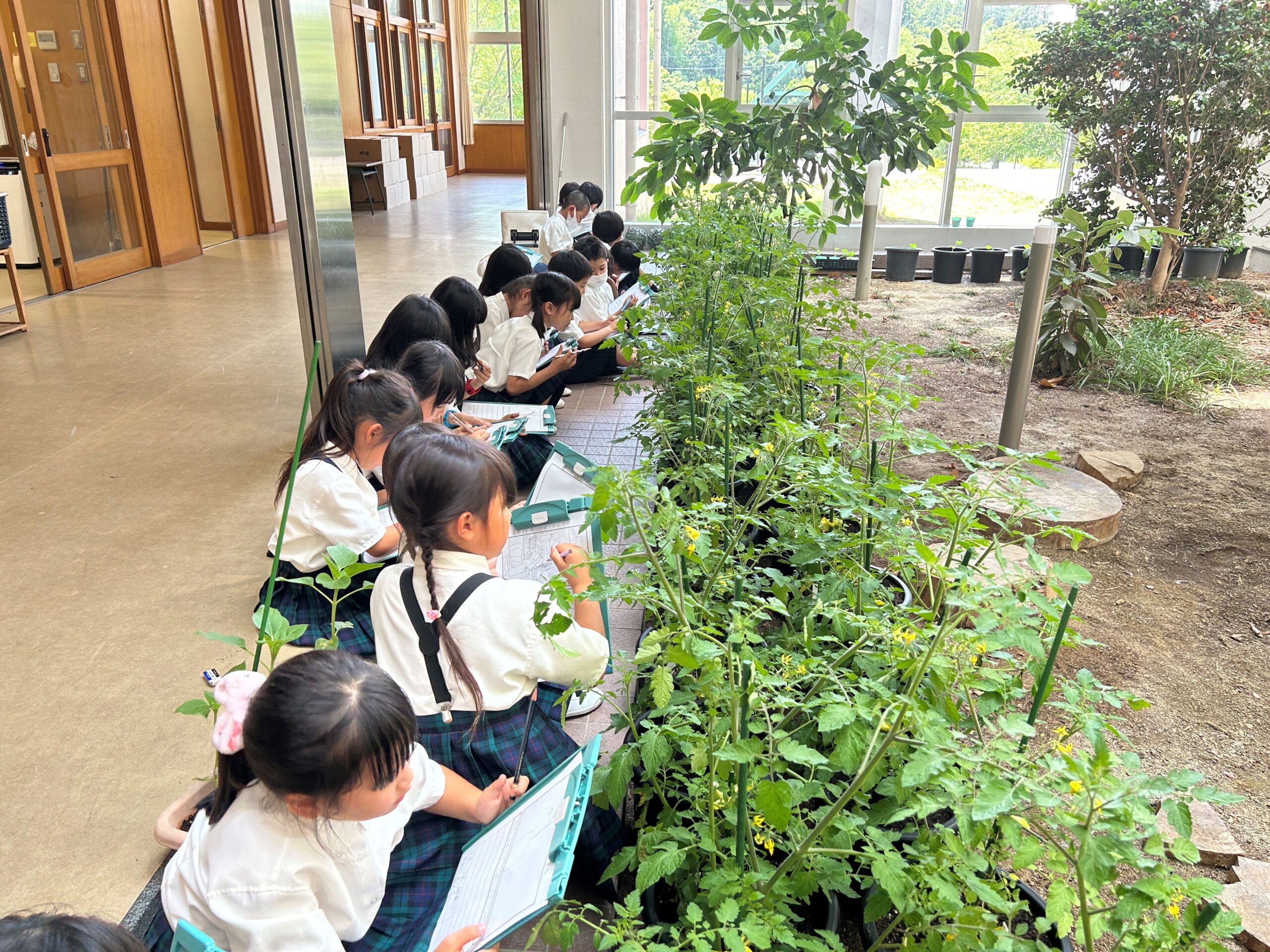 6月13日(火)生活科の授業で1年生がトマトの観察をしました。5月中旬の苗植えから毎日しっかりと水をあげて、今では花が咲き、実もつき始めています。赤く色づいた実を食べることができるのを楽しみにしている様子でした。