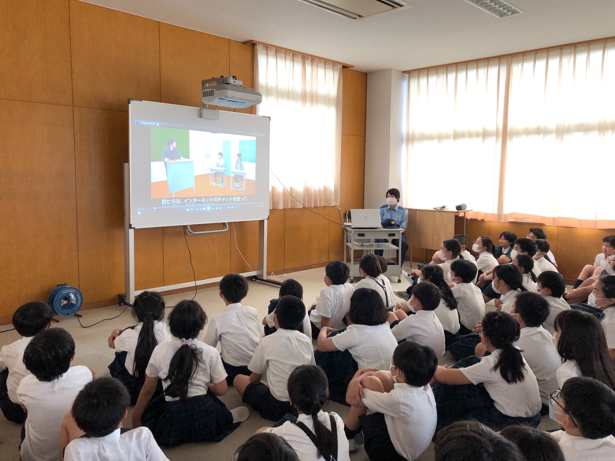 6月14日(水)4~6年生がネットトラブル防止教室に参加しました。毎年、桑名警察署 生活安全課の方にお越しいただき、スマホやSNS等に起因するトラブルなどについて教えていただいています。今回も実際にあった被害事例をもとに、インターネット利用の危険性や安全に使用する方法などについて学びました。スマホやインターネットはとても便利なものである一方、使い方を間違えるとトラブルになったり、犯罪に巻き込まれたりすることがあります。子どもたちの間でもより身近になってきているからこそ、ルールを守って正しく使用してほしいと思います。