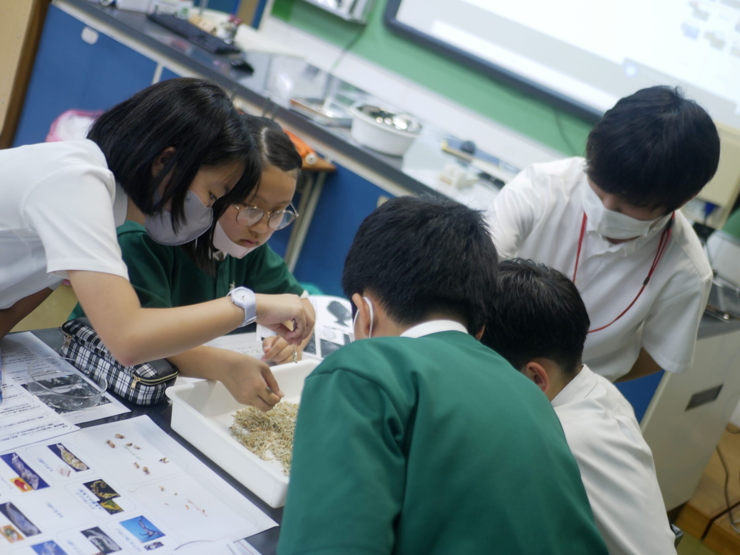 6月27日(火)6年生が津田学園中学校授業体験を行いました。津田学園中学校の理科室にて、海洋プランクトンの観察を行い、海にすむ生物を守るためにできることを考えました。 ピンセットとルーペを使用して観察したり、見つけた生き物を分類したりしました。児童は教師に質問しながら興味深く観察を進めているようでした。いつもと違った雰囲気の中、楽しみながら生き物について学べたと思います。