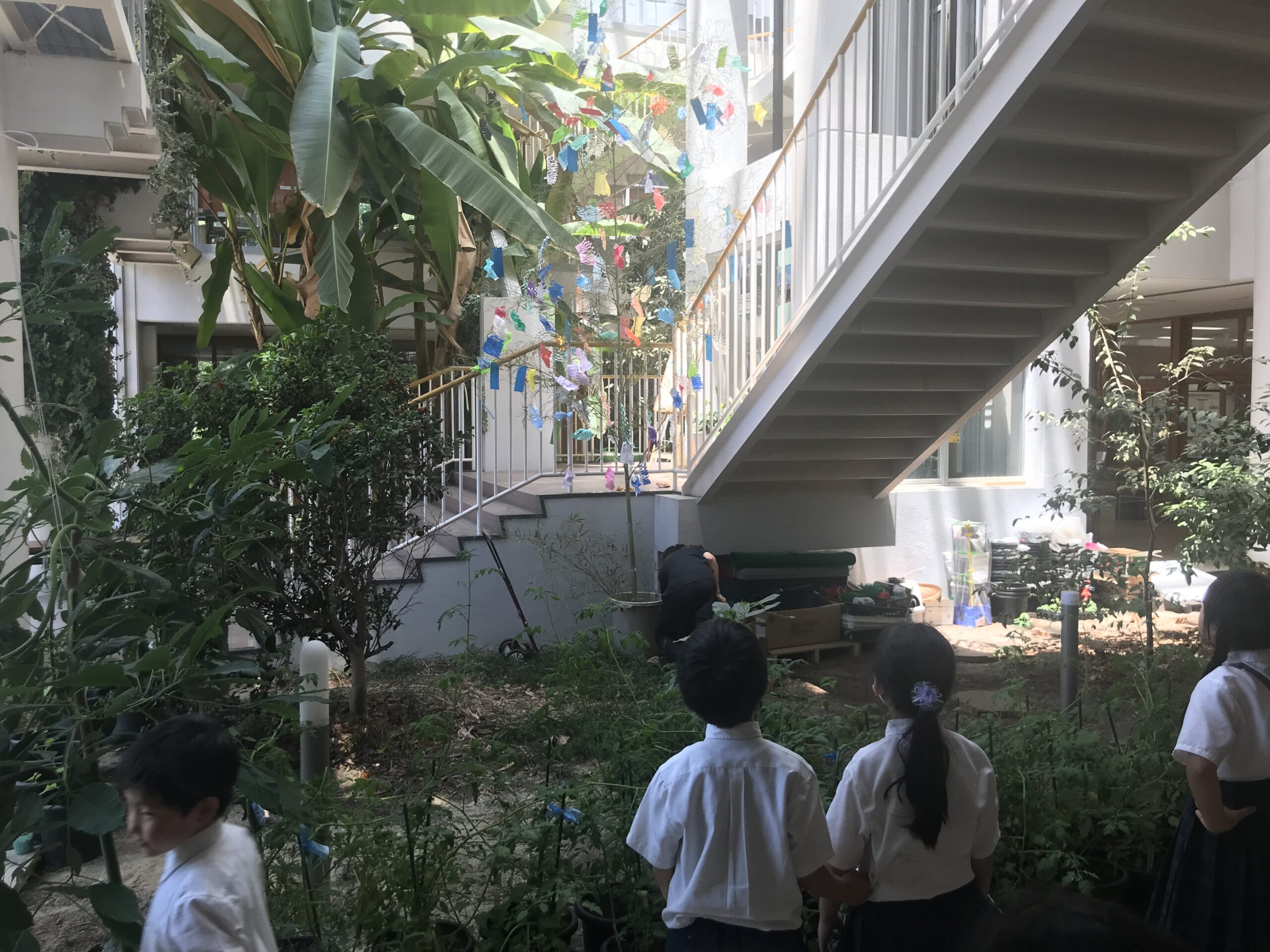 7月4日(火)1年生が七夕の飾りつけをしました。生活の時間に折り紙で天の川や貝飾りなどの飾りをつくりました。短冊には習い事や勉強とい った物事の上達、自分の努力で成し遂げられる夢や目標などの願い事を書いて、笹の葉に一生懸命結びつけていきました。たくさんの飾りや子ども達の笑顔でとても華やかな七夕となりました。