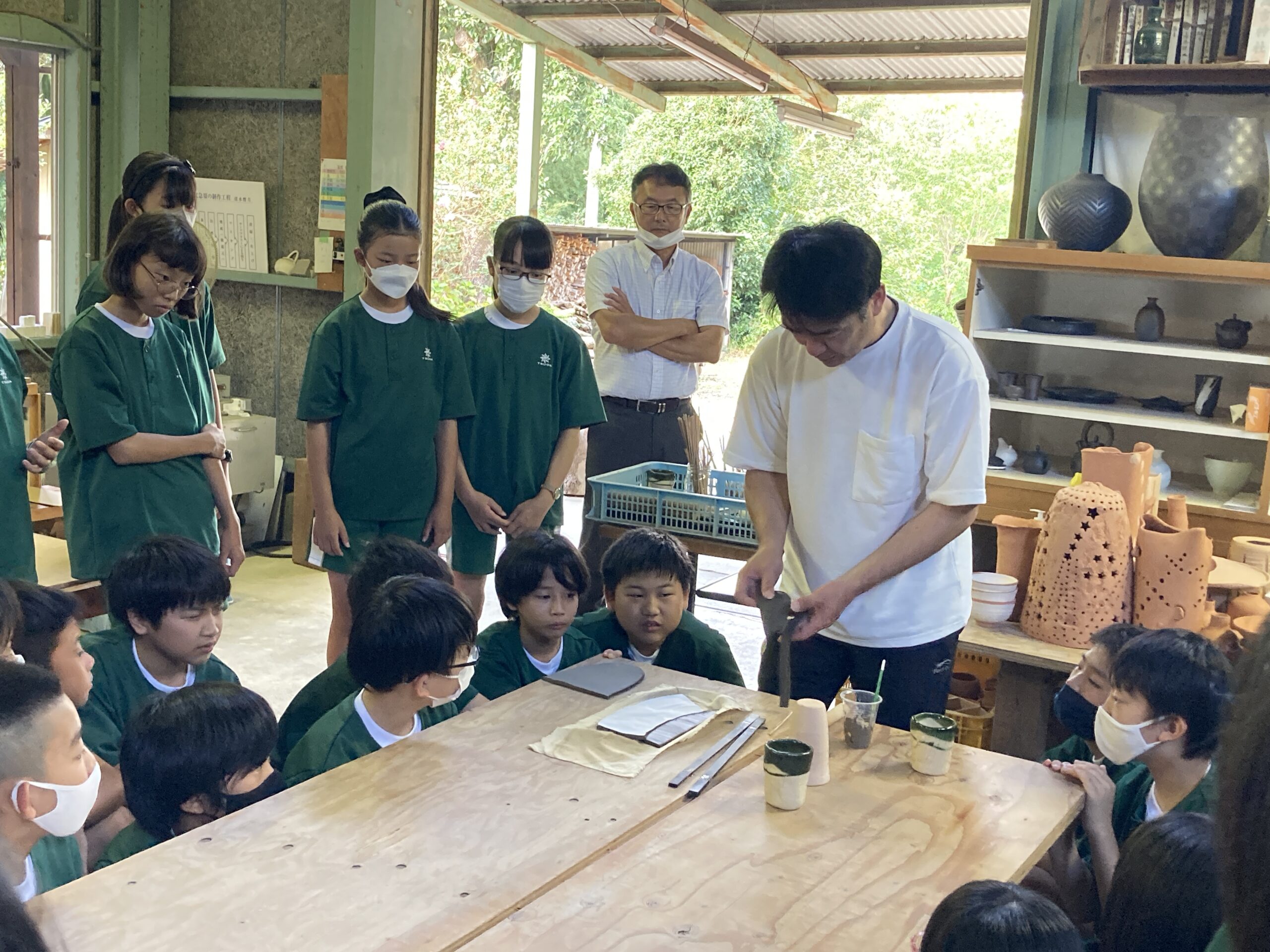 9月22日(金)6年生が四日市市にある萬古焼の窯元、醉月陶苑へ行き、たたら作りによる湯呑の作陶体験を行いました。始めて陶芸用の粘土に触れる児童もおり、粘土の感触に声を上げながらのスタートでした。思い思いのデザインで作陶に当たり、中には個性あふれる表現を追求する児童もいました。また、登り窯や電動ろくろの実演見学などもさせていただきました。電動ろくろの実演では、あっという間に出来上がる急須のパーツや茶わんに驚きの声が上がりました。制作した湯呑みは乾燥させ、施釉と焼成を経て醉月陶苑さんに学校へ運んでいただきます。どんな湯呑みが完成するのか、仕上がりが楽しみです。