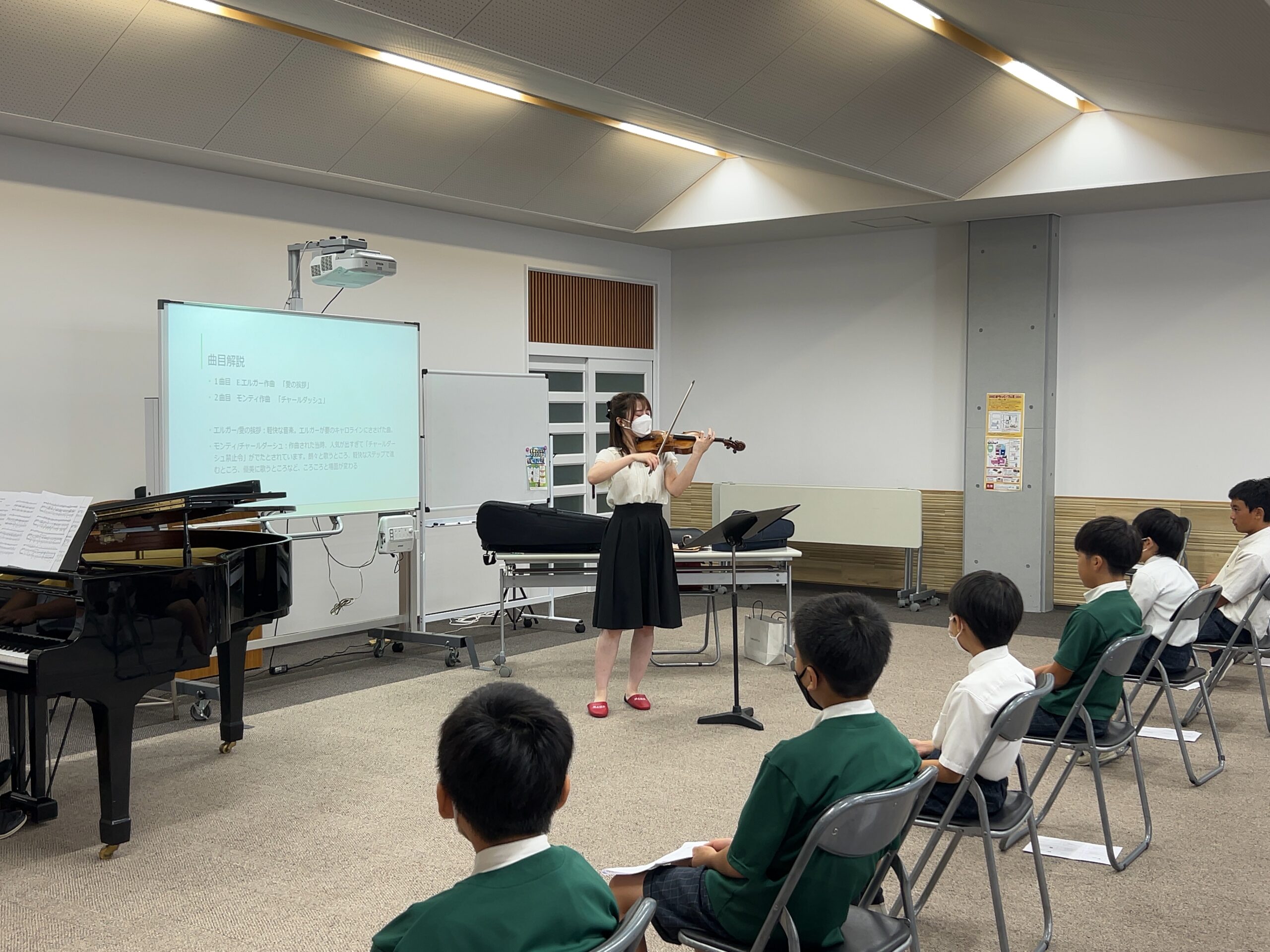 9月26日本校の2期生で、プロのヴァイオリン奏者である飯田 桐乃(いいだ きりの)さんにヴァイオリンの出前授業をしていただきました。授業を受けたのは5年生と6年生です。ヴァイオリンを始めたきっかけや進路についての話や、ヴァイオリンの歴史、仕組みを教えていただいたあとは演奏を聴かせていただきました。ヴァイオリンの知識を深めることができたとともに、プロの演奏を間近で聴くという貴重な経験ができました。