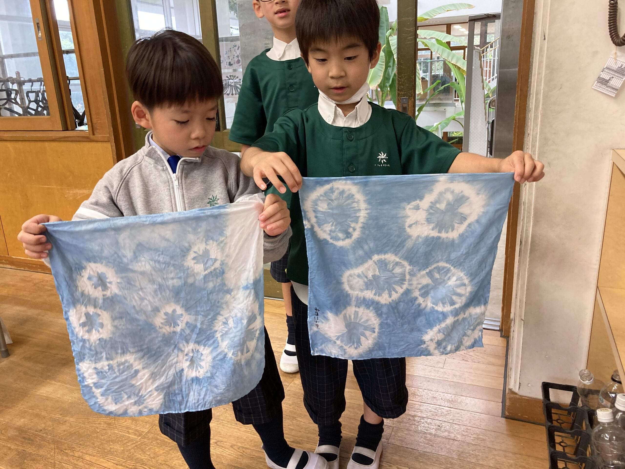 10月4日(水)2年生が花壇で育った藍の葉を使って絞り染めをしました。ビー玉を輪ゴムでハンカチにくくりつけ、藍の生葉をミキサーにかけて作った染液に浸します。ワクワクしながら染液から引き揚げると空気に触れた瞬間、緑色からみるみるうちに鮮やかな青色に変色し、児童から「うわー」と驚きの声が上がりました。水でよく洗い輪ゴムを外すと、桜やコスモスのような模様が現れ、子供達の顔から笑顔がこぼれました。植物の色素によって布が染められることを実感を持って学ぶことができました。