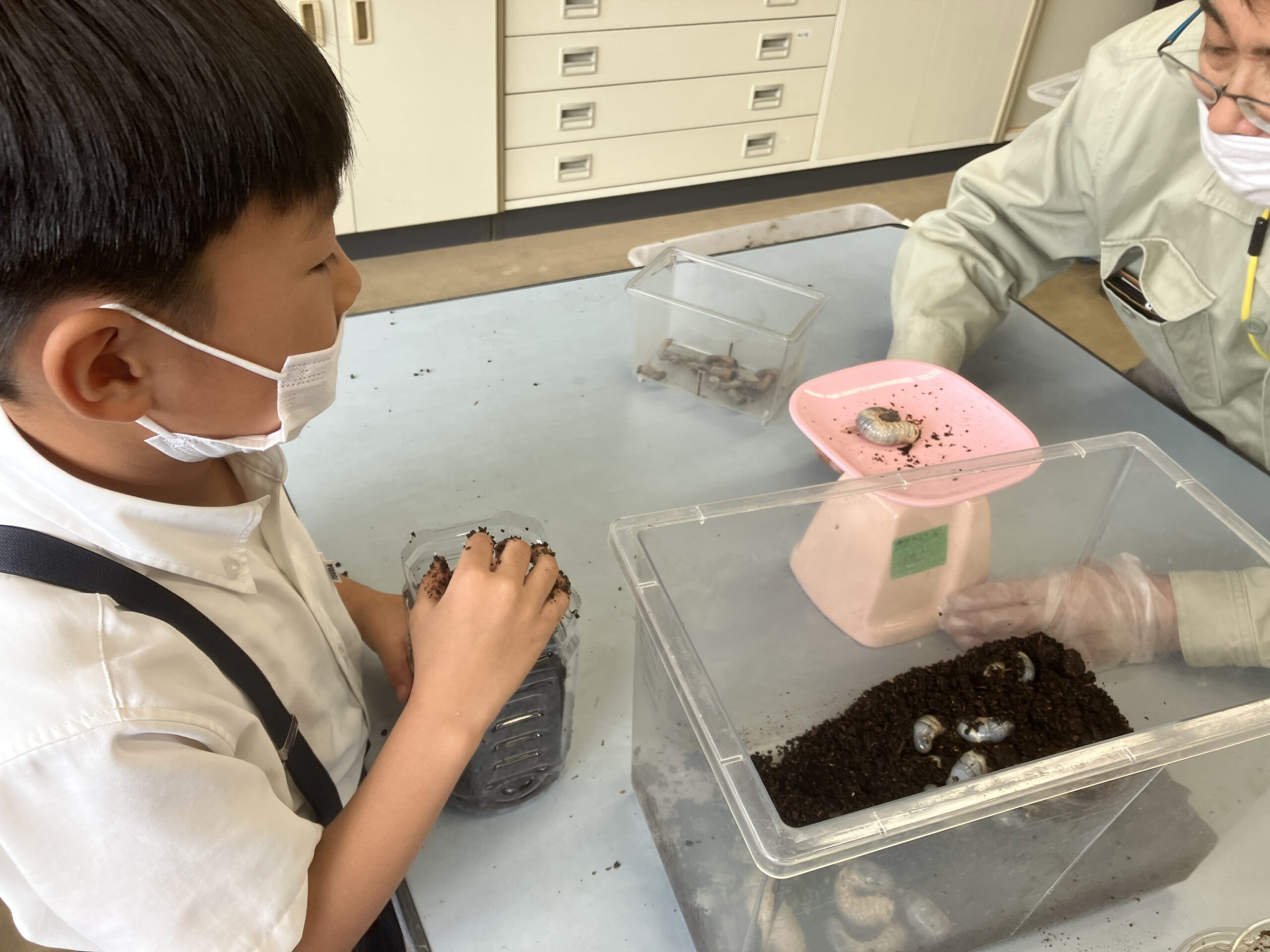 10月10日(火)2年生でカブトムシの飼育が始まりました。津田学園小学校では、2年生になると1人1匹カブトムシの幼虫をもらって成虫になるまで大切に育てます。はじめて幼虫に触る児童もおり、最初は怖がっていましたが実際に手に取ってみると愛着がわくようでこれからの飼育を楽しみにしている様子でした。
