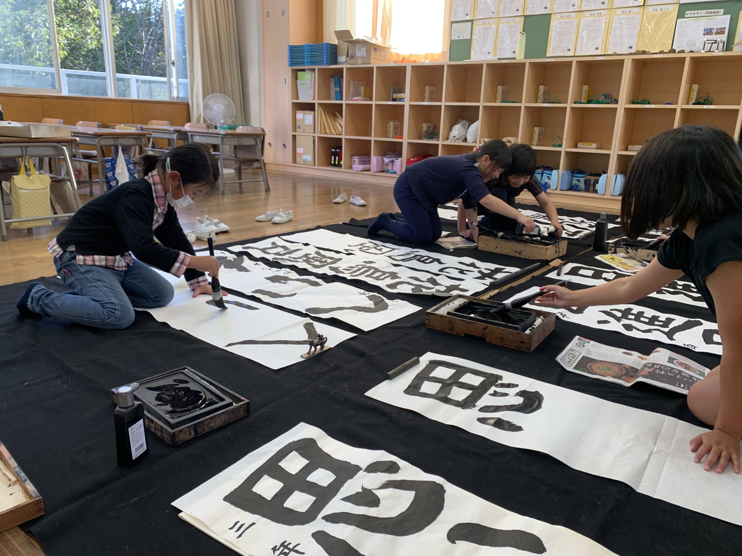 10月18日(水)に、2~6年生の希望者9名が半切指導を行いました。使用する筆や紙が普段の授業で用いるものよりも大きくなります。指導を受けた児童は、真剣に一文字ずつ書いていました。また、様子を見ていた児童からは「来年は私もやりたい。」と言った声も聴かれました。 今回書いた作品は、明治神宮書道会主催の全国少年新春書道展に出展されます。 ご指導いただいた寺尾先生、ありがとうございました。