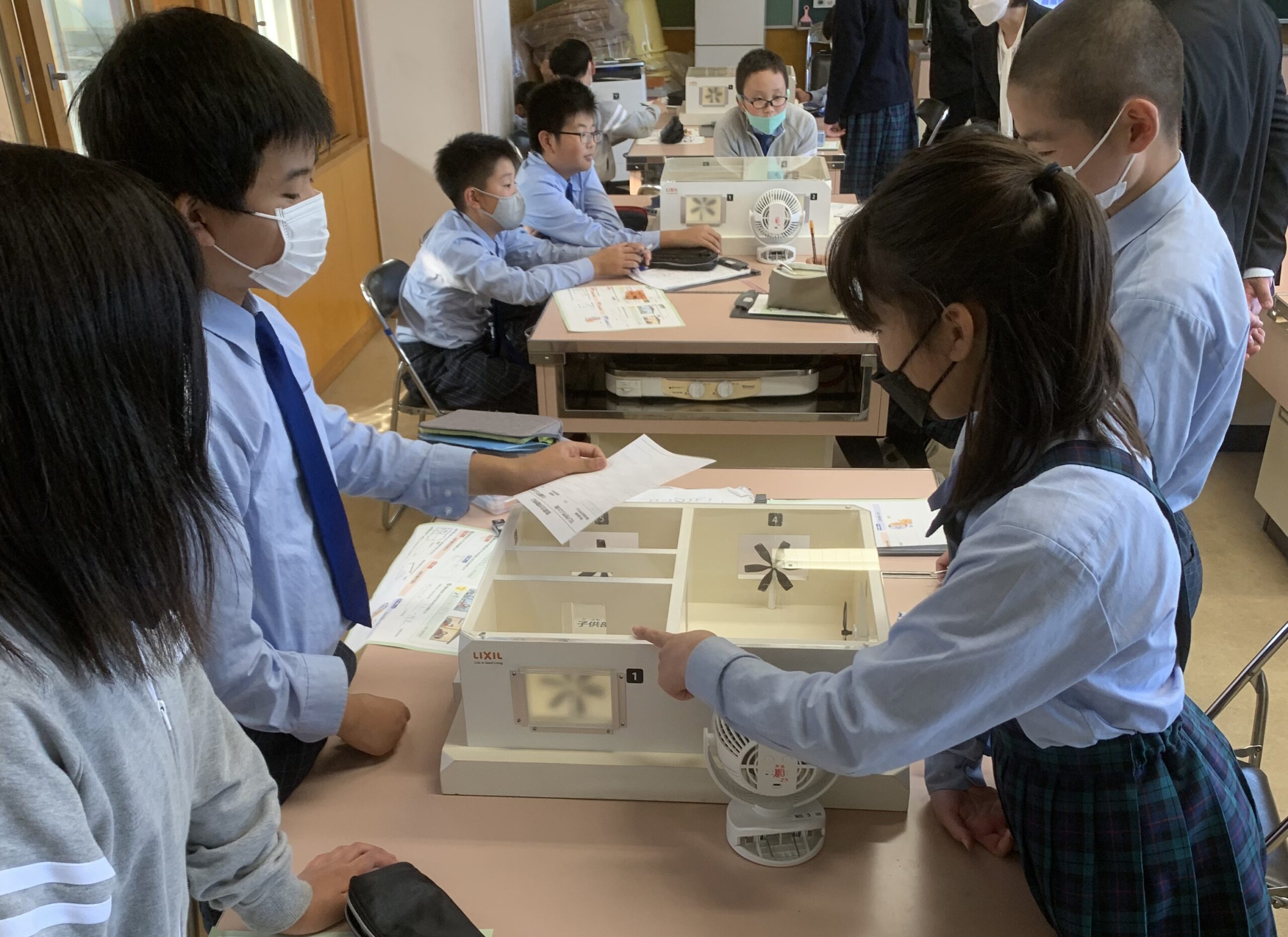 家の模型のどこの窓を開けると換気が効率的にできるのか扇風機の風を送り込んで風車を回す実験を行いました。子供たちはグループで話し合い、試行錯誤しながら正解を導いていました。