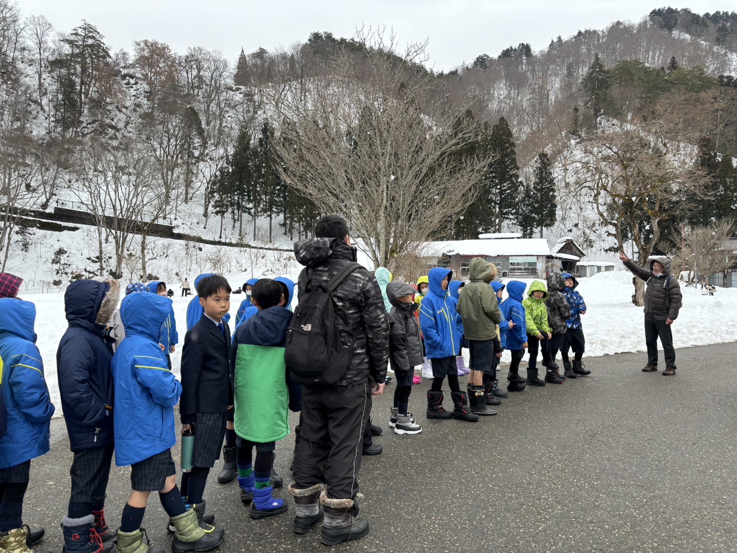 4年生が宿泊行事「雪の学校」に行きました。世界遺産である、雪深い岐阜県白川郷周辺を舞台に、冬の自然や雪をテーマにした2泊3日の体験学習です。6年間で最も楽しかった行事として声が挙がることも多い人気の高い行事です。 1月31日の初日はまず合掌集落内で郷土料理である朴葉味噌焼きや川魚の甘露煮などをいただきました。 その後、合掌造りの家々を見学しました。子どもたちは合掌造りに興味津々で、家の造りや豪雪地帯で生きる人々の生活の工夫、助け合いによって守られてきた文化などについて学びました。 白川郷見学の後は宿泊施設であるトヨタ白川郷自然学校に移動し、雪の灯ろう作りを行いました。様々な工夫を凝らしながら、雪の壁にオリジナルの灯ろうを作りました。ろうそくに火をつけると雪の中に暖かな光が灯り、幻想的な光景に喜ぶ姿が見られました。 夕食はフレンチのコース料理で、テーブルマナー講習をしていただきました。慣れないフォークやナイフの使い方に戸惑う様子もありましたが、大変美味しい夕食でした。 明日は大自然の中で様々なアクティビティを行います。