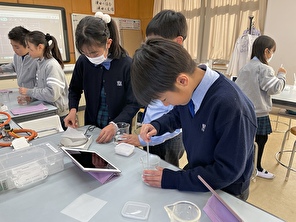 4年生の理科ではものの溶け方の学習をしています。水50g、100g、150gに食塩とミョウバンがそれぞれ何gまで溶けるのかを調べます。結果はiPadの学習アプリロイロノートのシンキングツールを利用してまとめます。シンキングツールは子供たちの思考をまとめるのに適したツールになっていて、さまざまな場面で活用されます。